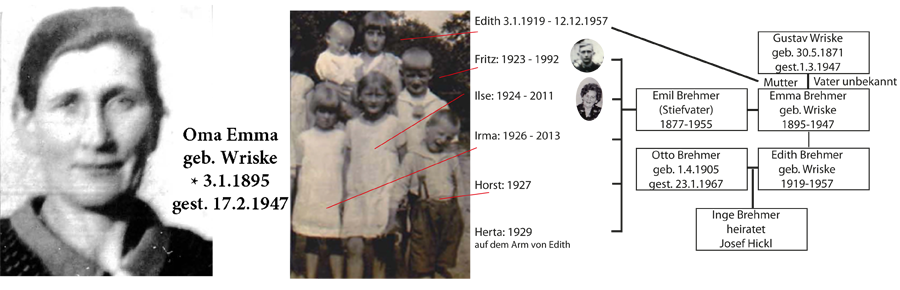 Emma Wriske lebte vom 3.1.1895 bis zum 17.2.1947. An ihrem eigenen Geburtstag im Januar 1919 bringt sie ihre Tochter Edith zur Welt. Wer der Vater dieses Mädchens ist wird nie bekannt und weil Emma Wriske den Emil Brehmer heiraten will, wird Edith von den Großeltern finanziell versorgt. Die Großeltern von Edith werden ihr Vormund. Emil will dieses Kind nicht ernähren. Durch diese Umstände bleibt Edith eine Aussenseiterin in der Familie. Sie muß ihre Mutter mit Tante Emma ansprechen.
